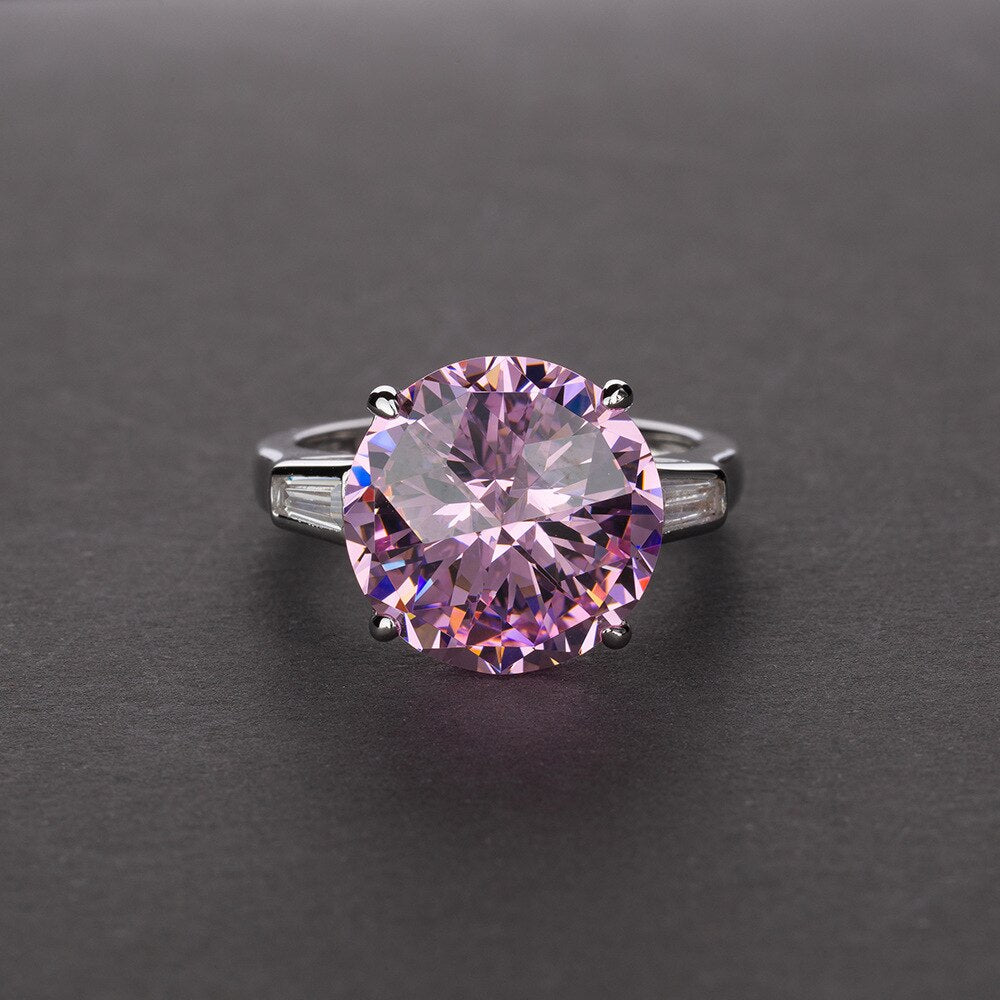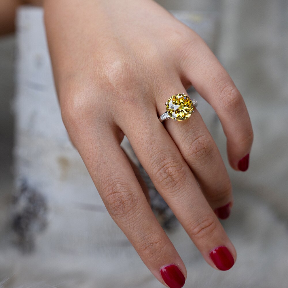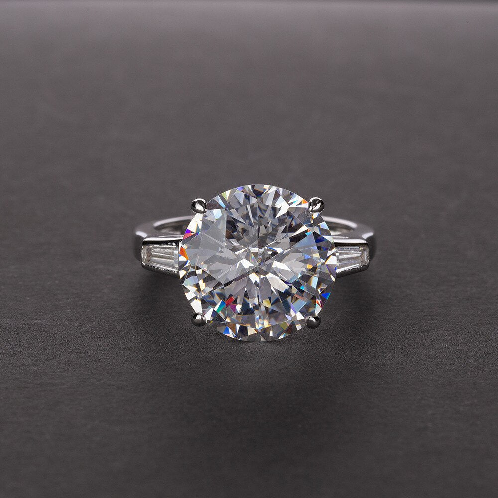 This stunning ring replicates a $14,500 look with a 3 carat round brilliant cut flawless center stone, and trapezoid baguette cut side stones. This amazing timeless ring is a perfect addition for your collection and serves well as an engagement ring as well. This beautiful ring gives you the same look of white gold and diamonds at a fraction of the cost. The stones are flawless moissonite, which sparkle with incredible fire and brilliance. They are all individually hand set by experienced master jewelers. The ring is made out of genuine 925 sterling silver. Just like white gold jewelry, the metal has a lustrous rhodium top layer which protects it from tarnish.