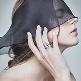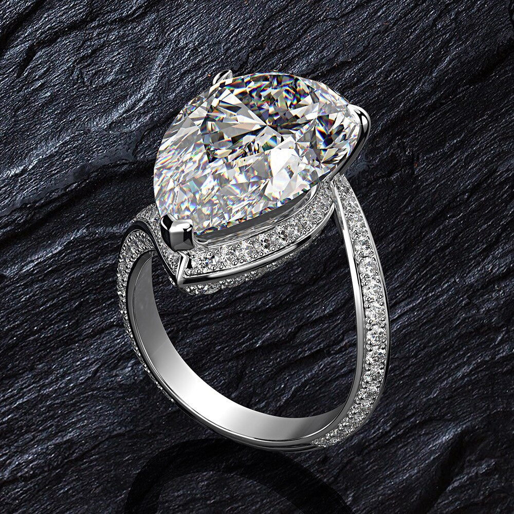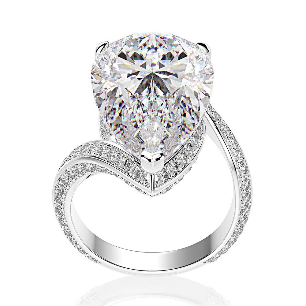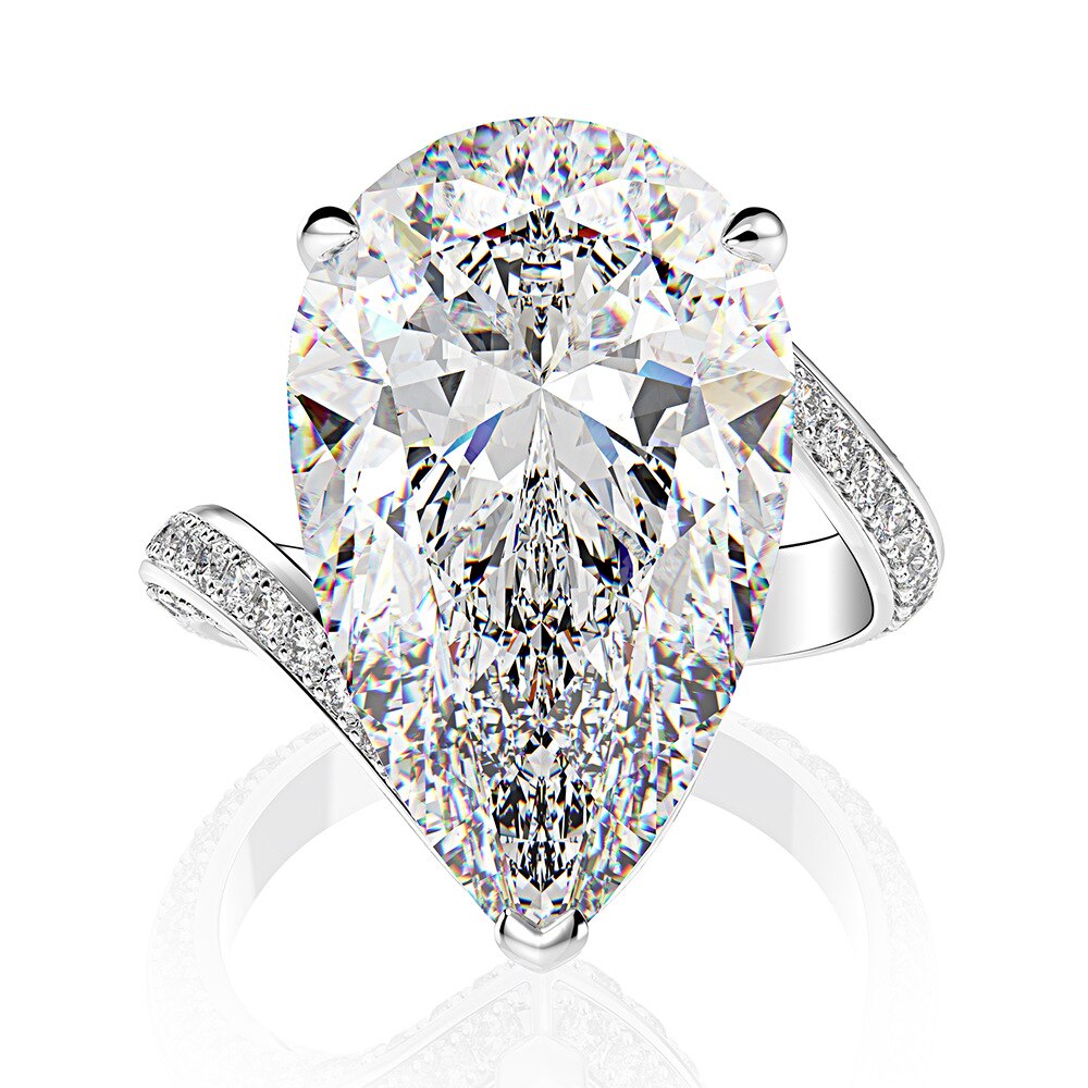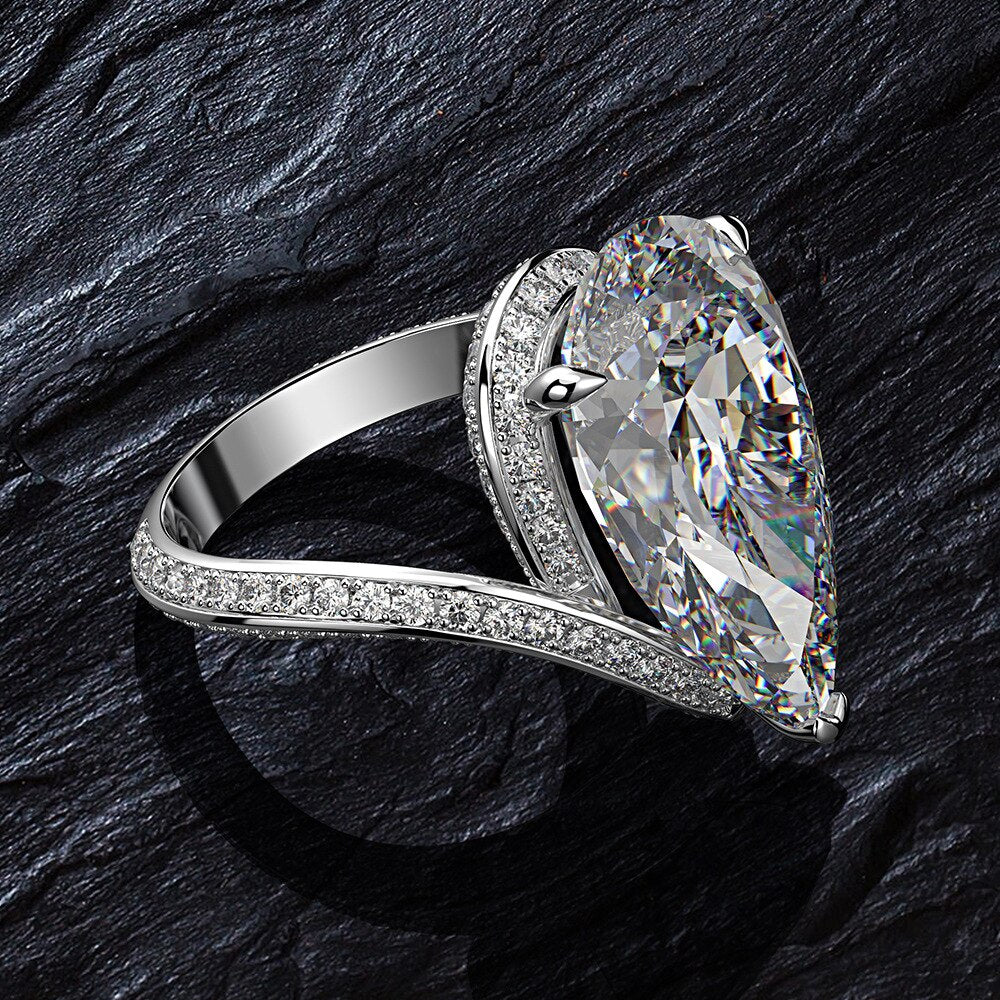 This stunning ring replicates a $14,500 look with a 3 carat pear cut flawless center stone, and round cut side stones. This amazing timeless ring is a perfect addition for your collection and serves well as an engagement ring as well. This beautiful ring gives you the same look of white gold and diamonds at a fraction of the cost. The stones are flawless moissonite, which sparkle with incredible fire and brilliance. They are all individually hand set by experienced master jewelers. The ring is made out of genuine 925 sterling silver. Just like white gold jewelry, the metal has a lustrous rhodium top layer which protects it from tarnish.