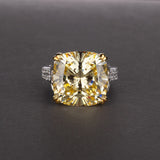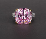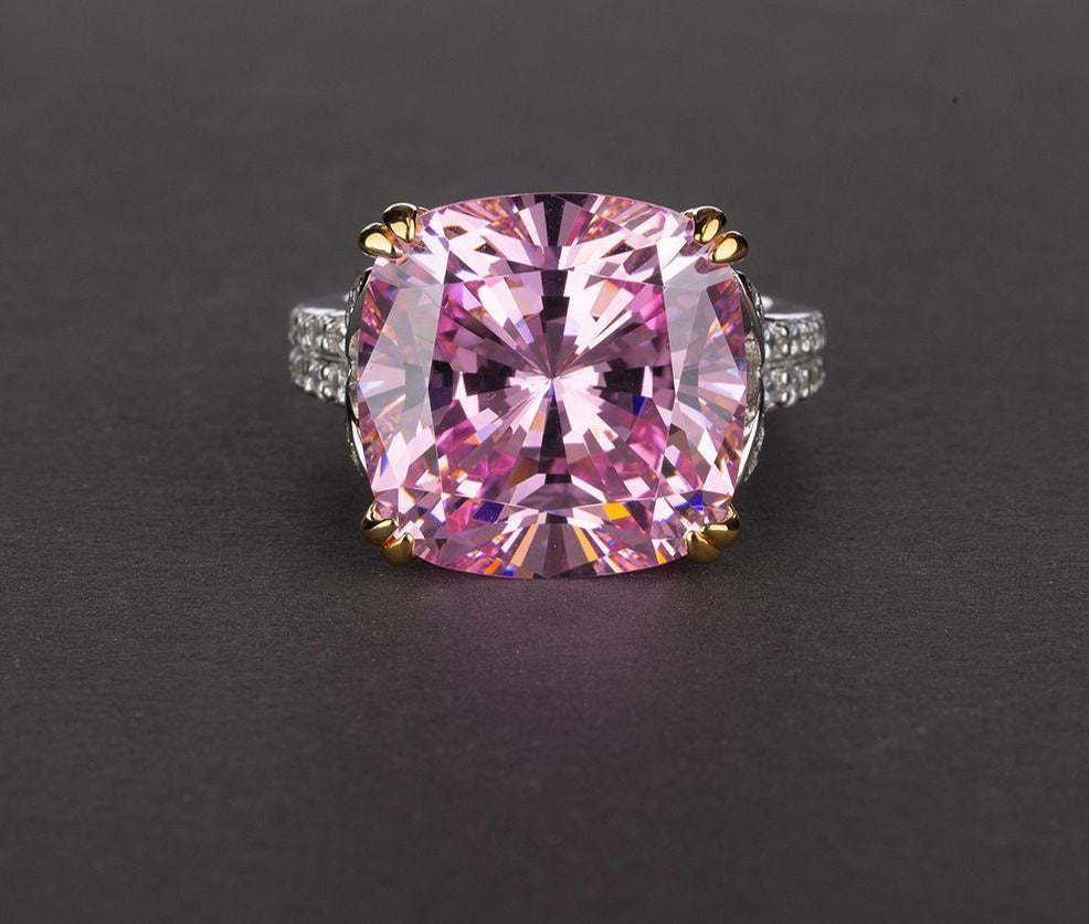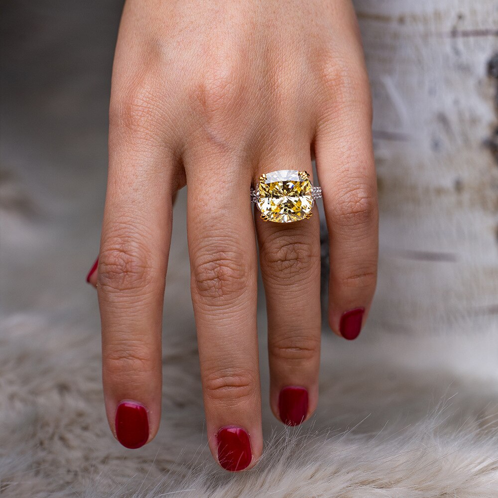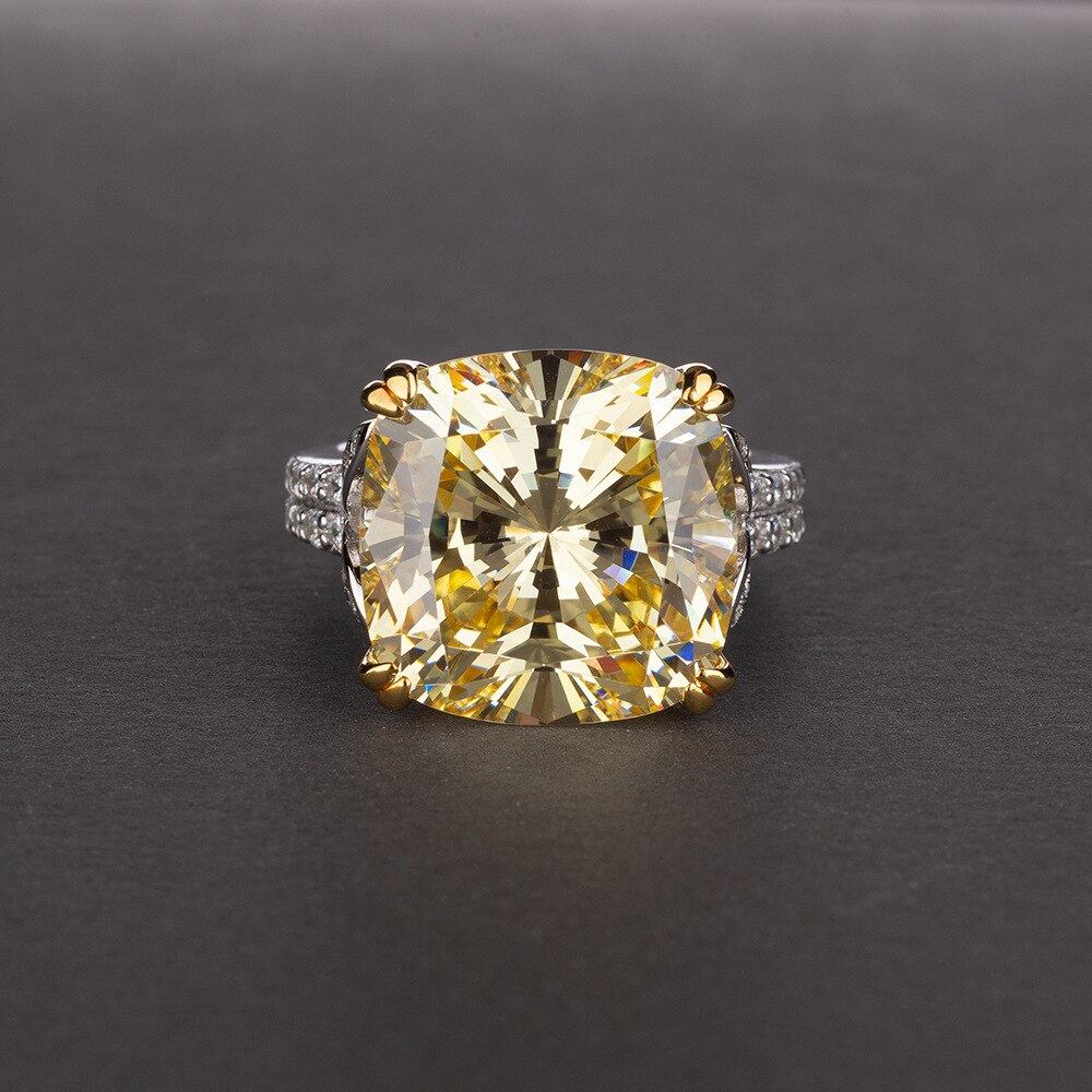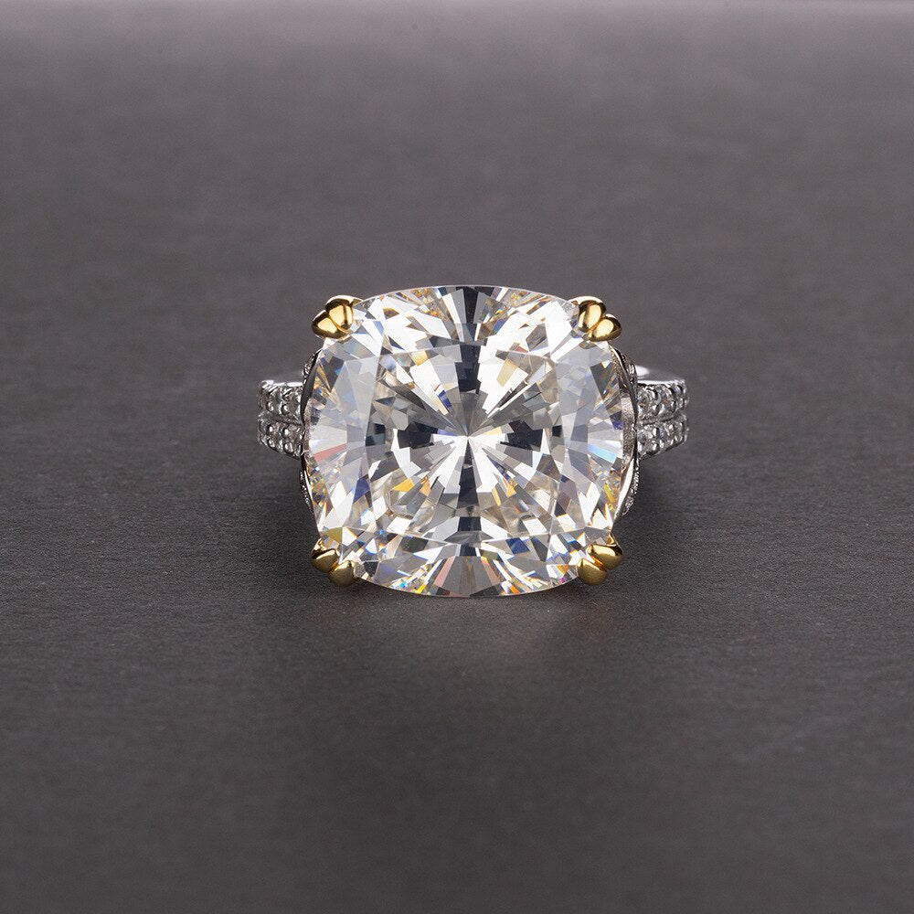 This oversized statement piece features 14mm x 14mm cushion cut flawless stones prong set on a 3.5mm thick band. This is a great fashion piece that looks good dressed up or down. This beautiful ring gives you the same look of white gold and diamonds at a fraction of the cost. The stones are 5A flawless moissonite, which sparkle with incredible fire and brilliance. They are all individually hand set by experienced master jewelers. The ring is made out of genuine 925 sterling silver. Just like white gold jewelry, the metal has a lustrous rhodium top layer which protects it from tarnish.