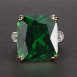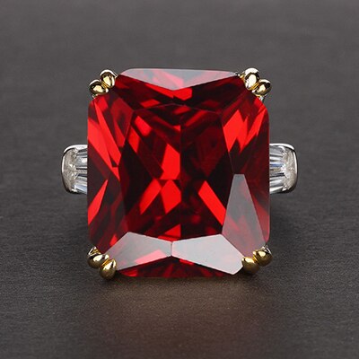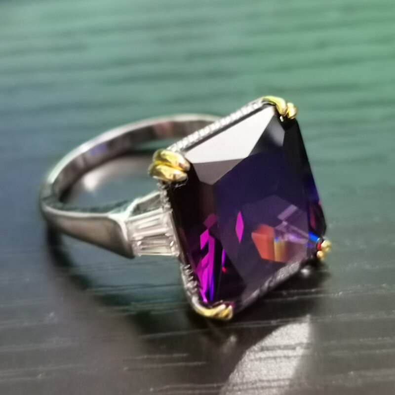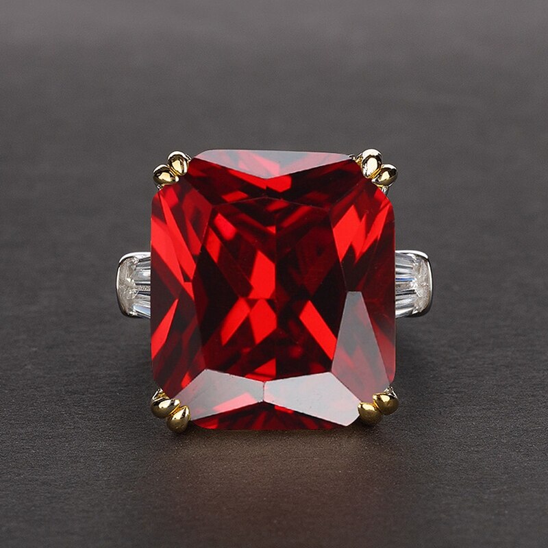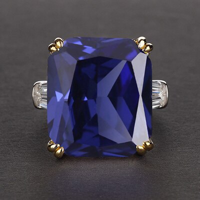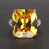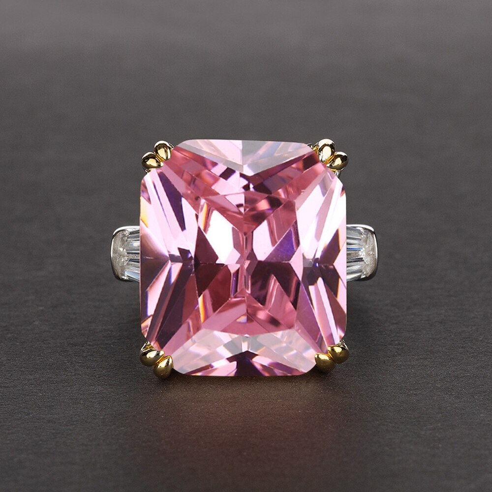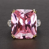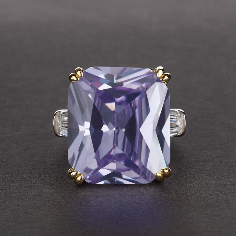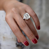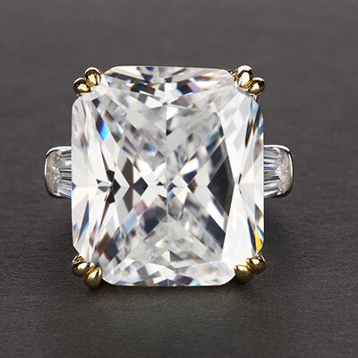 This stunning ring features a 5.50 carat 14x16mm asscher cut center stone with a classic 4 prong setting. This simple design is impressive and eye-catching.