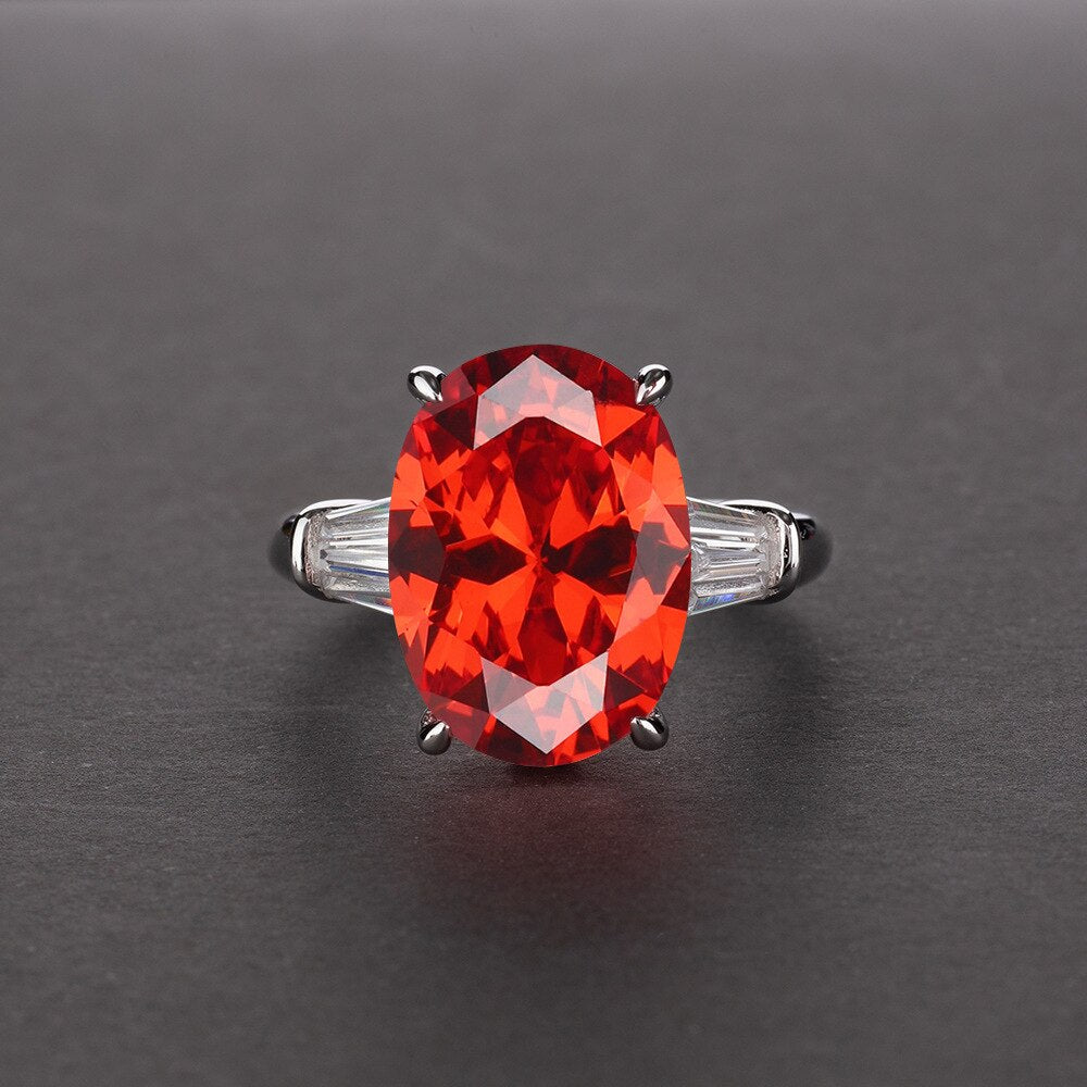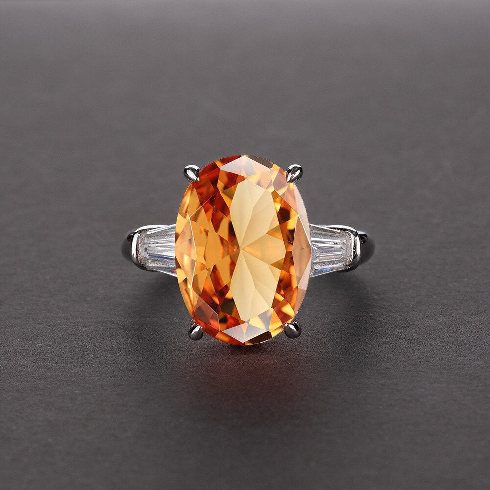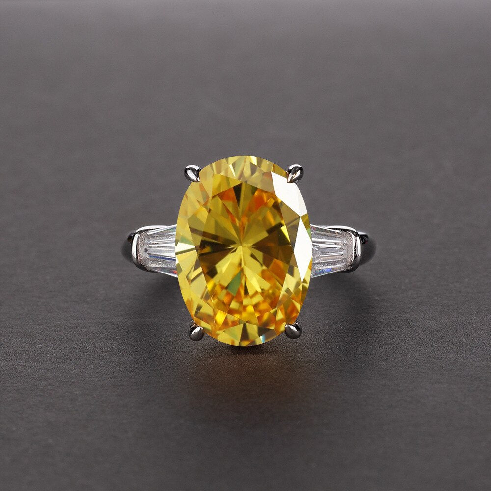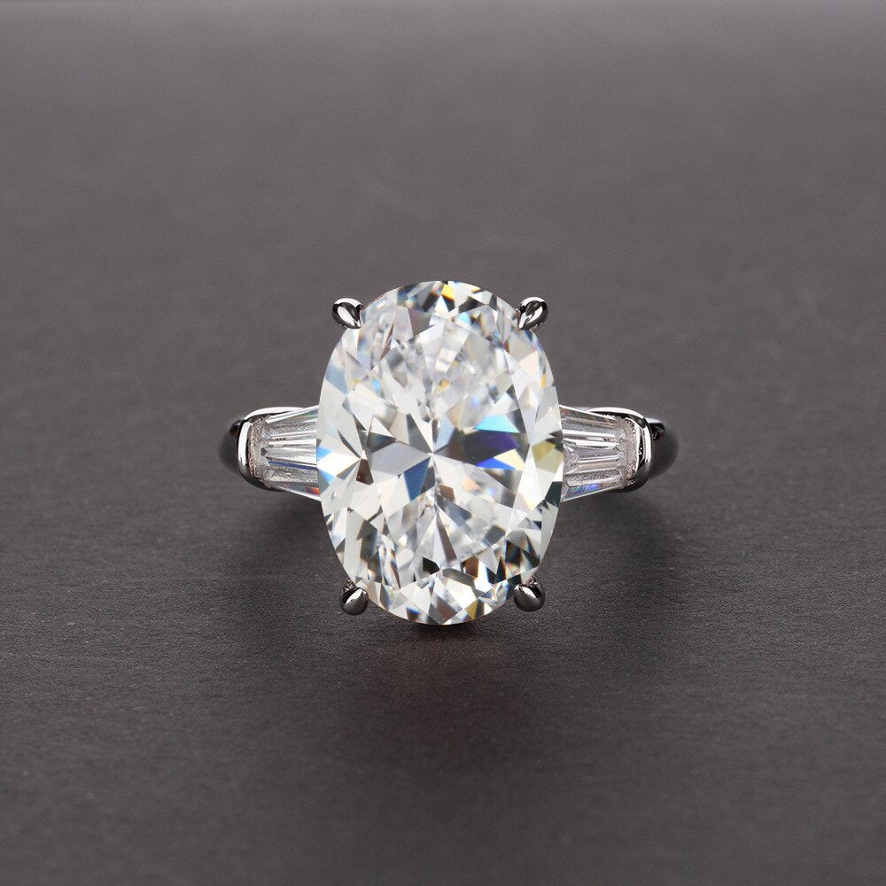 This oversized statement piece features 14mm x 14mm oval cut flawless stones prong set on a 3.5mm thick band. This is a great fashion piece that looks good dressed up or down. This beautiful ring gives you the same look of white gold and diamonds at a fraction of the cost. The stones are 5A flawless moissonite, which sparkle with incredible fire and brilliance. They are all individually hand set by experienced master jewelers. The ring is made out of genuine 925 sterling silver. Just like white gold jewelry, the metal has a lustrous rhodium top layer which protects it from tarnish.