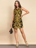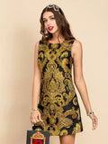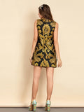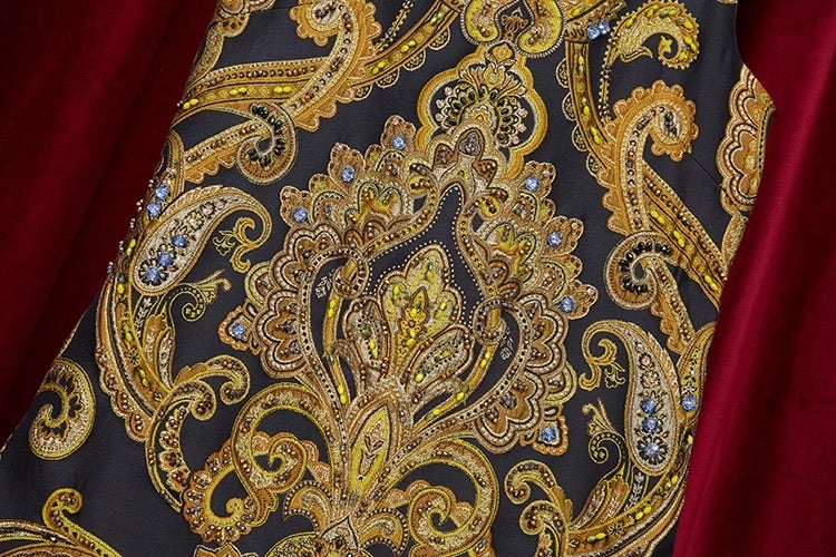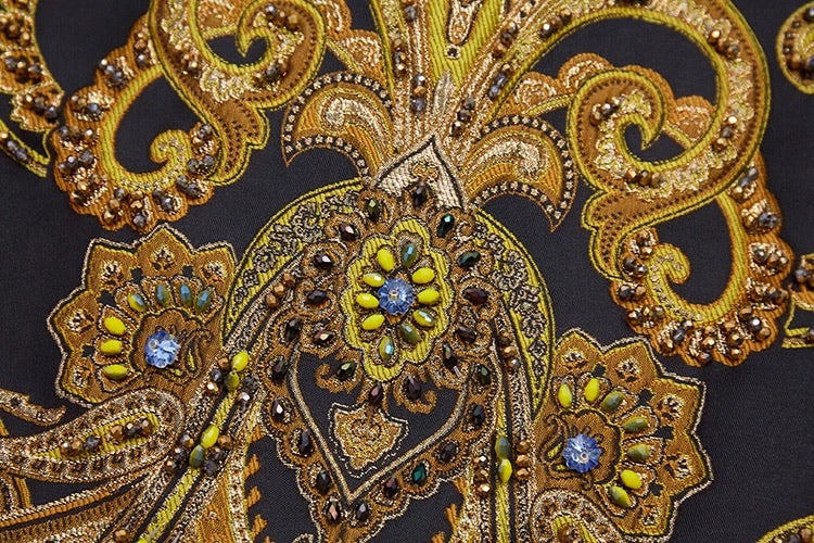 A plunge neckline, draping and the iconography o Sicilian style are the key feature of this silk chiffon long dress. On the neck and waist rhinestone-decorations and embroideries gather the fabric thus creating flouncy puckering. Body lining. Leather belt at waitline Hook and zipper fastening at centre back.