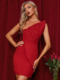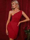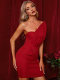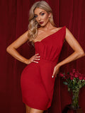 Dappled long evening halter single shoulder dress with plunging V shape neckline. The waist is highlighted by an engulfing tight design. Straight skirt with. Concealed zipper fastening at centre back. Body lining.