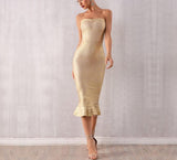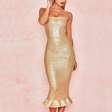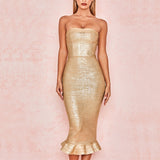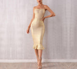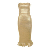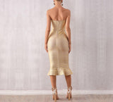 This Roma stitch, strapless sheath dress is decorated all-over with the brand’s stae of the art use of golden colour fabric. Zipper fastening at centre back.