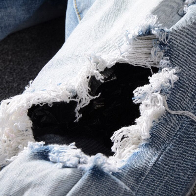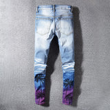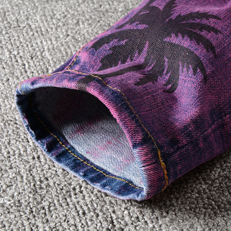 Rips and tears have been placed all-over these stone washed denim 6 pocket pants. Palm tree decorations and coloured drippings make the garment a “must have item”. Metal buttons fastening. Two needle stitching. Fit: Straight.