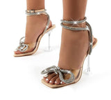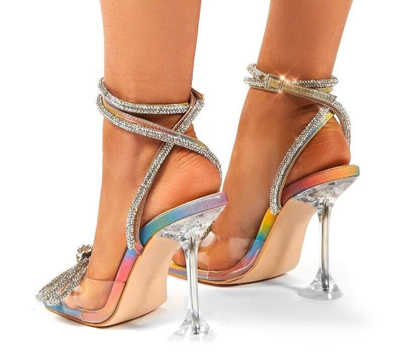 Satin heels stilettos. A ribbon lace ornament crystals encrusted on the toe and ankle high lace. Dappled-print inside and footbed. Varnish sole. Heel: 120 mm.