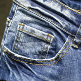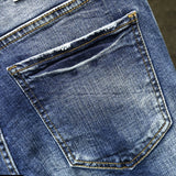 One of the features of these stone washed stretch denim 6 pocket pants are the deliberate adds in perfect modern street style of rips and tears.Decorations have been added all over. Shiny decorations are overprinted on both legs and on the right rear pocket. Single metal button at waist. Lower back pockets and a leather patch with the brand’s hexagonal logo on the right one. Two needle stitching. Fit: Super Straight