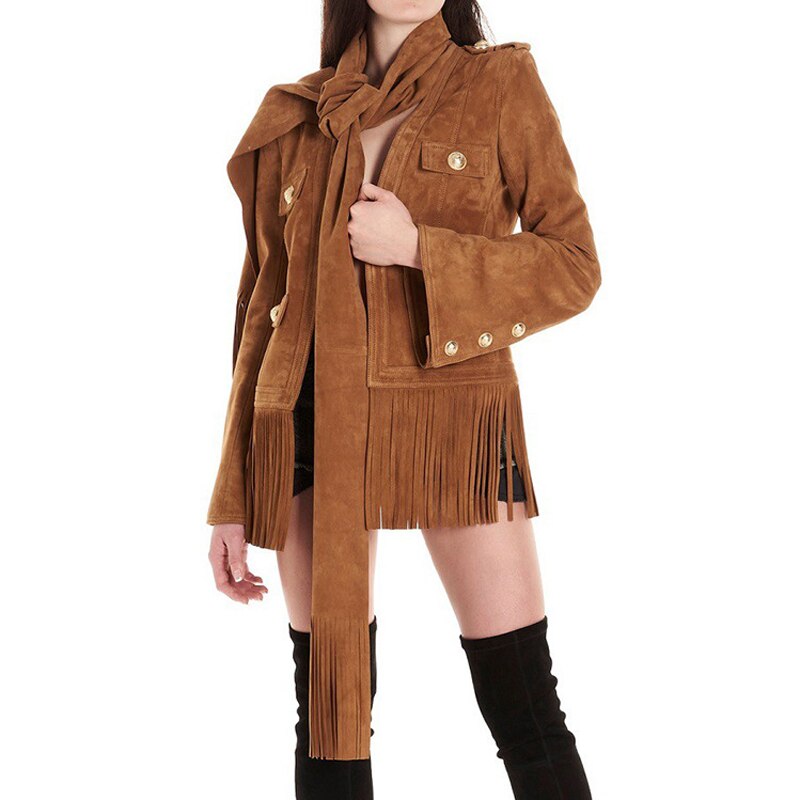 Hollywood glamour for this leather crepe jacket. A slit on the hem of the bottom side is decorated with fringes. Metal button fastening. Two flap pockets. Inner lining. Belt / Scarf included.