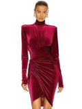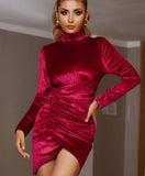 Pleat and fold work enriched stretch viscose velvet jersey evening dress. turtleneck neckline with decorative bra. Central pleated drape. pleated skirt. Zipper fastening at centre back. Long comfortables sleeves.