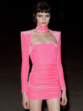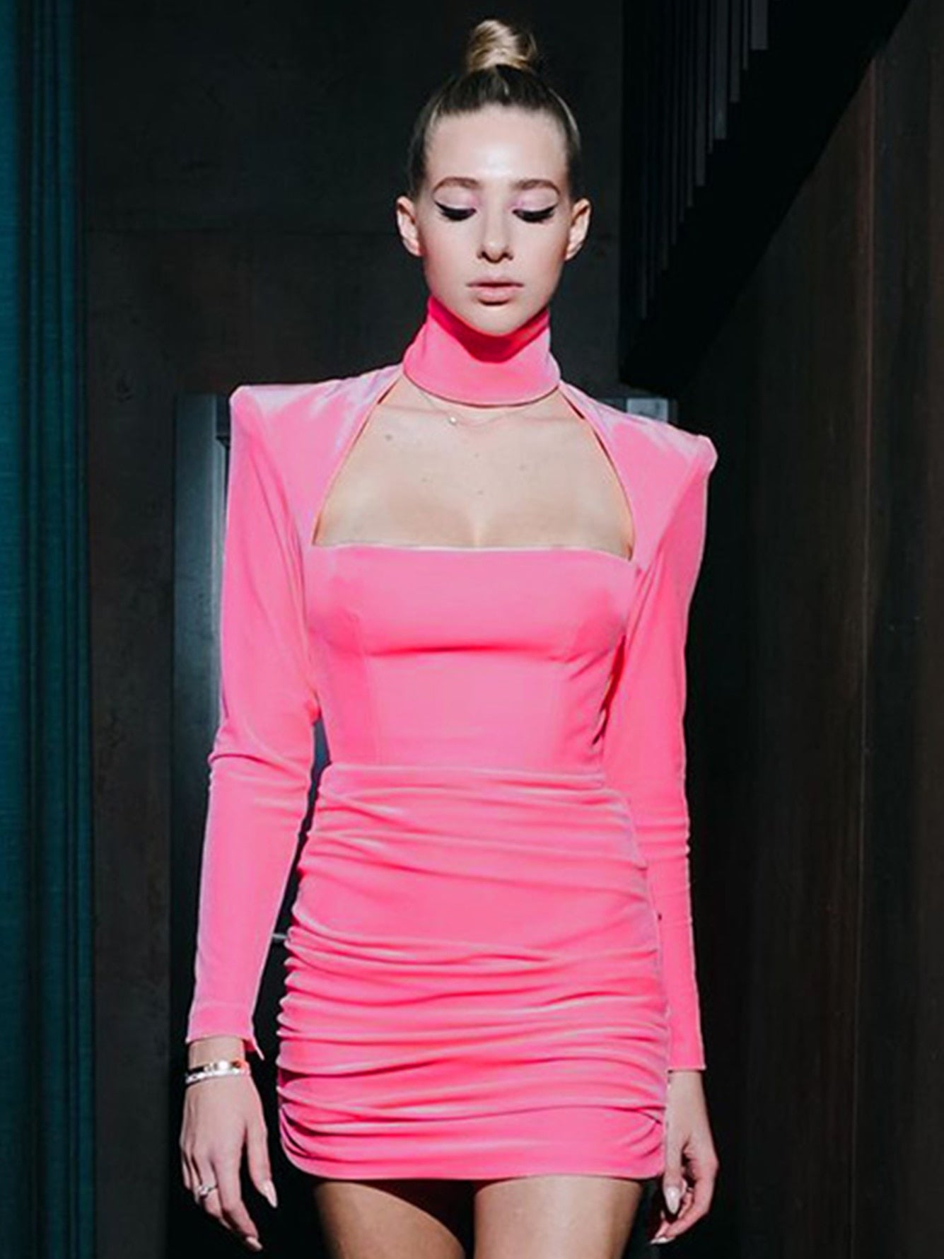 Sexy long-sleeve stretch viscose jersey slip dress. Choker neckline. Draped and symmetric. Straps with decorated safety pins. Invisible zipper fastening at centre back.